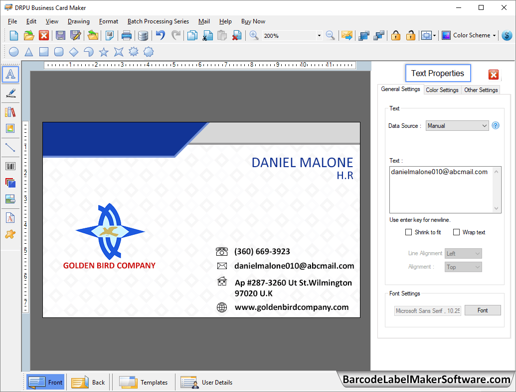 Select any of the above option to start designing business cards. Here Start with Templates option is selected.Specify card name, card size, card type and card shape according to your need. Click on “Finish” button to continue.Screenshot shows front view of Add text, set font and color on business card using text property.You can edit card name, size, shapes, card type and set border from card properties.