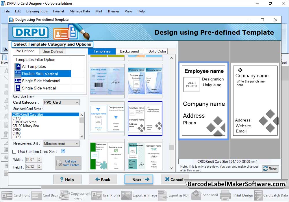 Software provides various pre-defined ID Card Design samples (templates) with different backgrounds. Choose any one template, enter card size and click on 'Next' button.